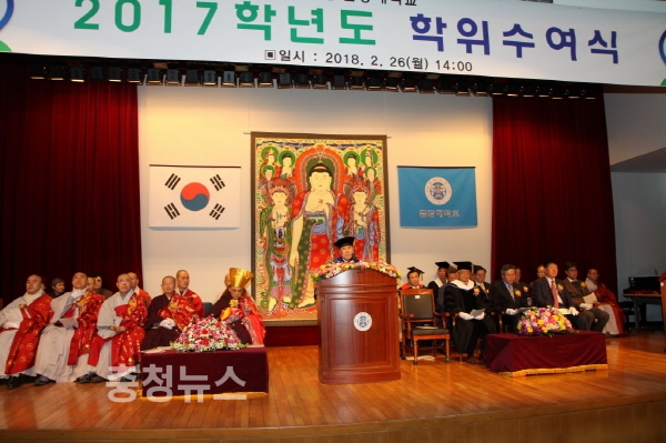 또한 변춘광 학교법인 이사(대한불교 천태종 총무원장)는 치사에서 “항상 진취적인 생각을 강조하면서, 긍정적인 생각과 적극적인 행동 그리고 포기하지 않는 끈기를 가지고 더 큰 꿈을 꾸고 더 밝은 희망을 품고 노력하면 반드시 성공할 수 있다”며 사회의 첫발을 내딛는 졸업생들을 격려했다.