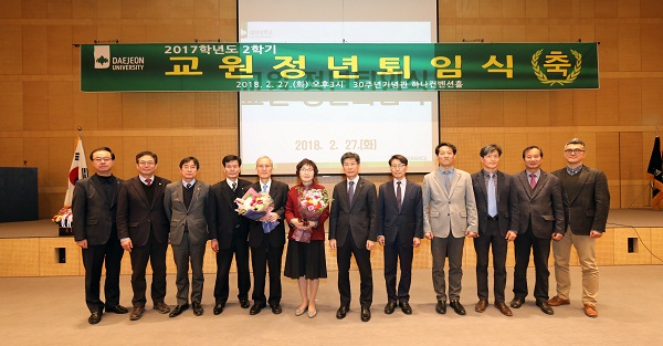 대전대는 27일 교내 30주년기념관 하나컨벤션홀에서 이종서 총장을 비롯해 대학 보직교수와 대학관계자 및 가족 친지 등이 참석한 가운데 행정학과 안성호 교수와 영미언어문화전공의 이행수 교수 정년 퇴임식을 개최됐다.
