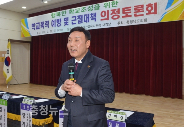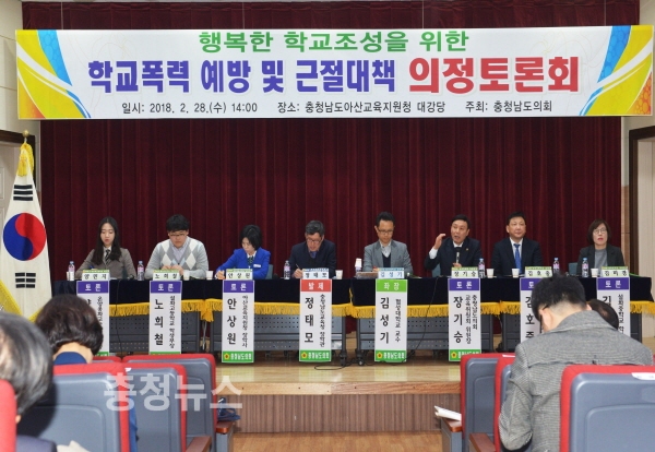 충남도의회는 28일 아산교육지원청에서 ‘행복한 학교 조성을 위한 학교폭력 예방 및 근절대책’을 주제로 의정토론회를 개최했다.