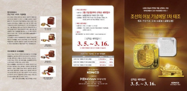 ‘태조가상시호금보(太祖加上詩號金寶)’기념메달은 금(37.5g), 금도금(31.1g), 은(31.1g) 3종으로 금 300개, 금도금 500개, 은 1,000개 한정수량으로 선착순 판매될 예정이다. 판매가격(부가세 포함)은 개당 금 275만원, 금도금 33만원, 은 29만 7000원이다. 3월 5일부터 16일까지 조폐공사 쇼핑몰, 전국 농협과 우체국 지점, 풍산화동양행과 현대백화점 온라인몰에서 판매될 예정이다.