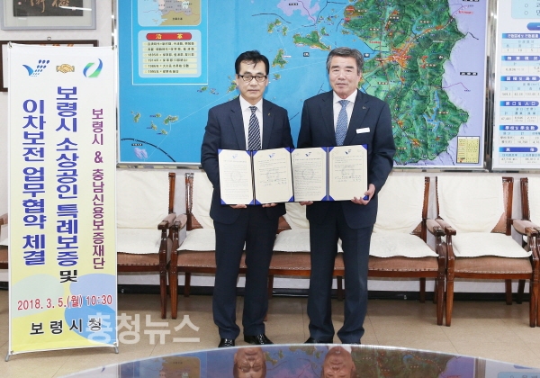 충남 보령시는 5일 오전 시장실에서 김동일 시장과 정철수 충남신용보증재단 이사장 등 관계자가 참석한 가운데 소상공인 특례보증 및 이차보전 지원업무 위탁 협약을 체결했다.