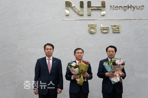 왼쪽에서부터 조소행 충남농협 본부장과 김천규 온양농협 상임이사, 김봉배 서산농협 상임이사가 함께 수상