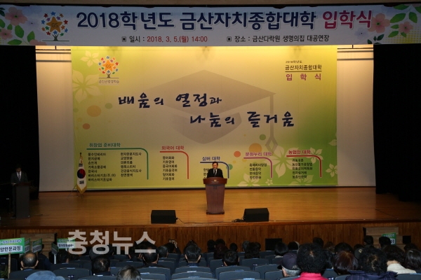 ‘배움의 열정과 나눔의 즐거움’이라는 슬로건 아래 금산군이 주최하고 금산교육사랑장학재단에서 운영하는 2018학년도 금산자치종합대학 입학식이 지난 5일 금산다락원 대공연장에서 성황리에 개최됐다.
