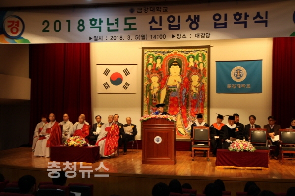 금강대학교가 5일 오후 교내 대강당에서 송희연 총장과 변춘광 학교법인 부이사장(대한불교 천태종 총무원장), 학교법인 사무처장 월장 스님, 교수 및 대학 관계자들과 학부모 등이 참석한 가운데 2018년도 입학식을 가졌다.