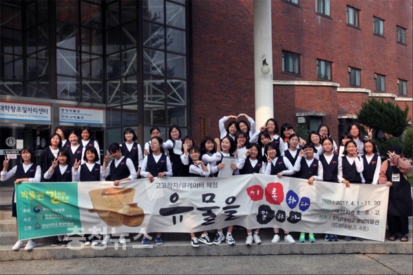 한남대 중앙박물관의 ‘유물을 기록하다, 말하다’ 프로그램을 마치고 대전 호수돈여자중학교 학생들이 기념촬영을 하고 있다.