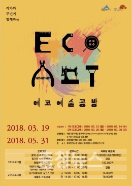 세종시민이면 누구나 참여 가능한 ‘2018 에코예술공방’은 세종시문화재단 홈페이지를 통해 12일부터 선착순으로 접수 가능하며, 프로그램별 커리큘럼과 일정, 재료비 등 세부 사항은 홈페이지를 통해 확인할 수 있다.