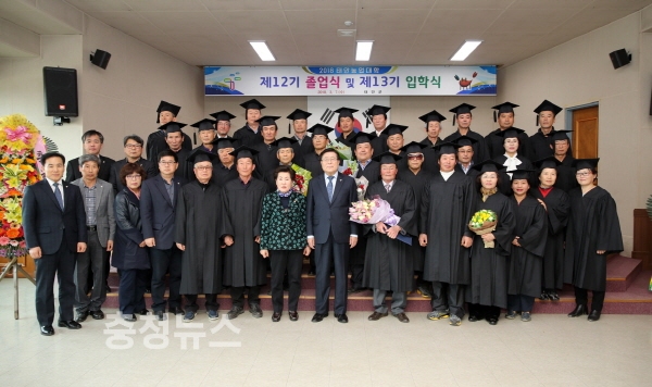 충남 태안군이 지난 7일 군 농업기술센터 대강당에서 한상기 태안군수를 비롯해 이용희 군의회 의장, 제12기 졸업생 36명, 2018년 입학생 52명 등 110여 명이 참석한 가운데 ‘2018 태안농업대학 제12기 졸업식 및 제13기 입학식’을 개최했다.