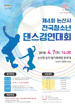 충남 논산시(시장 황명선)는 오는 4월 7일, 2018 논산딸기축제장 본무대에서 ‘제4회 논산시 전국청소년 댄스경연대회’를 개최한다.