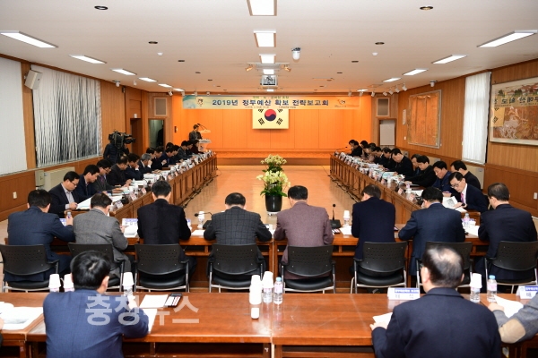충남 홍성군은 9일 군청 대강당에서 김석환 홍성군수, 홍문표 국회의원, 김덕배 군의회 의장과 군의원 및 도의원, 군청 부서장 등 50여 명이 참석한 가운데 2019년 정부예산확보 전략보고회를 개최했다.
