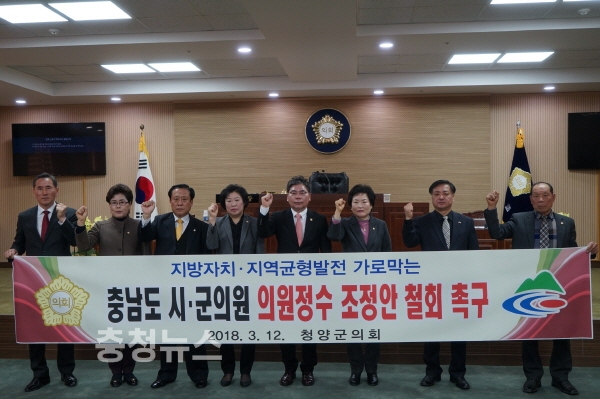청양군 의회는 청양군의회의원정수를 축소하는 충청남도 시군구의회의원선거구 획정안 철회를 촉구하고, 청양군의회의원정수를 현행의원 정수인8명으로 조정해 줄 것을 강력히 요구하며, 향후 감소안으로 지정된 3개군과 연대하여 법적 투쟁도 불사하는 등 강력 대응하기로 하였다.