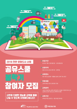 이번 프로그램은 문화체육관광부의 문화특화지역 조성사업 국비 공모사업을 통해 선정된 ‘천안 문화도시 사업’의 일환으로 공유를 기반으로 시민이 직접 교육을 기획하고 운영하는 것이 특징이다.