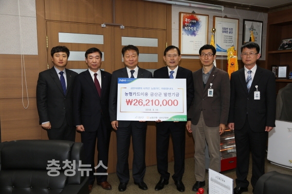 NH농협은행 금산군지부(지부장 권기홍)는 15일 금산군 발전을 위해 써 달라며 ‘금산사랑 발전기금’ 2621만 원을 기탁했다.
