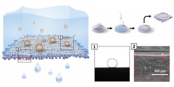 POSTECH 기계공학과 통합과정 홍성경 씨와 임근배 교수팀은 충남대 기계공학부 조성진 교수 연구팀과의 공동연구를 통해 물 속에서 기름이 스며들지 않는 수중 초발유성 셀룰로스 기반의 나노섬유 멤브레인(막)을 제작해 고속으로 대용량의 물기름 분리를 진행하는 기술을 개발했다.