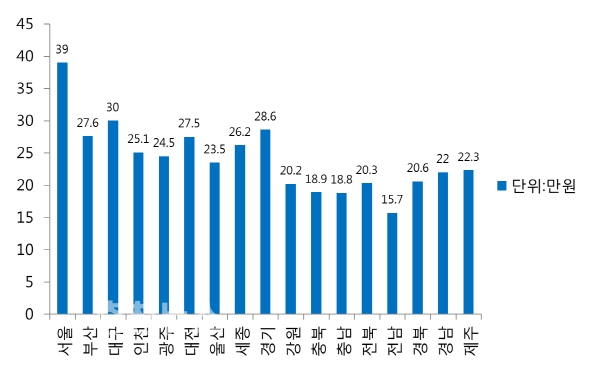 시도별 학생 1인당 월평균 사교육비는 서울이 39만원으로 가장 많고, 대구 30만원, 경기 28만6000원, 부산 27만6000원, 대전 27만 5000원으로 드러났다.