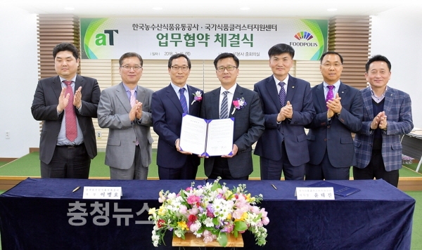 한국농수산식품유통공사(aT, 사장 이병호)와 국가식품클러스터지원센터(이사장 윤태진)는 농식품 수출기업 경쟁력 제고를 위한 업무협약을 15일 aT 본사에서 체결했다.