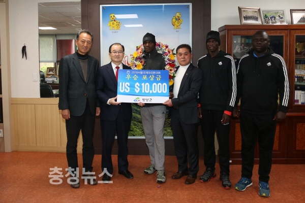 이석화 청양군수는 이 자리에서 포상금 1만 달러를 전달하면서 “작지만 강한 청양을 알리고 대한민국의 육상 발전을 위한 인적 보배”라고 격려했다.