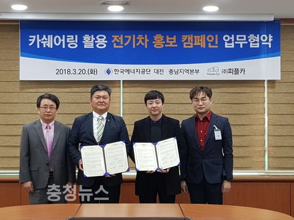 한국에너지공단 대전․충남지역본부(본부장 김주완)는 20일 대전시 대덕구에 위치한 공단 지역본부에서 ㈜피플카(대표이사 강석현)와 함께 카쉐어링을 활용한 전기차 홍보 캠페인 추진을 위한 업무협약을 체결했다.