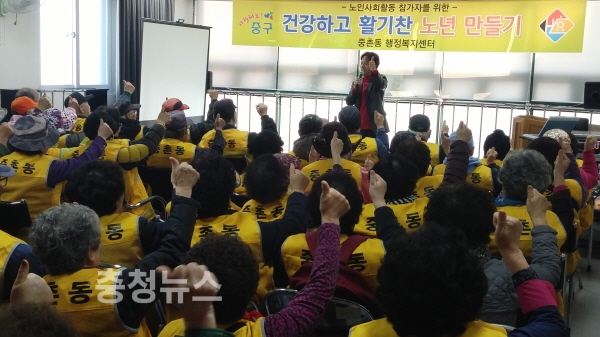 대전 중구 중촌동 행정복지센터(동장 강창석)는 지난 23일 노인일자리 참여자 70여 명을 대상으로 하루를 건강하고 활기차게 보낼 수 있는 건강관리법과 웃음치료 교육을 실시했다.