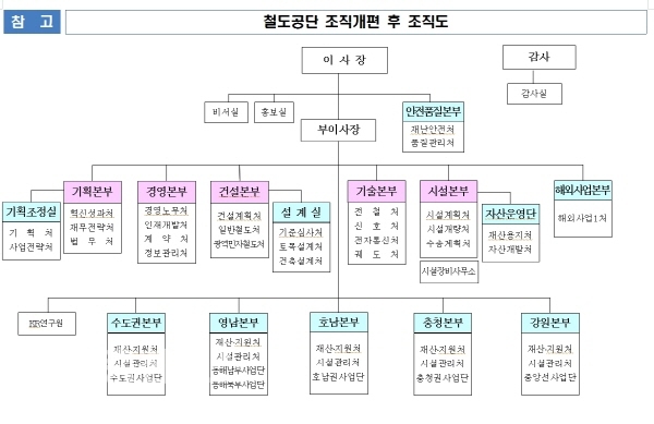 또한, 철도건설 분야의 기술력 강화를 위해 설계실을 신설하고, 설계와 시공기능을 별도로 분리하여 전문성을 제고하는 한편, 재산운영 및 자산개발 분야의 신 성장사업 추진역량을 확대하고, 시설관리자로서 역할강화 등 기능별 전문성 강화를 위해 자산운영단을 신설한다.