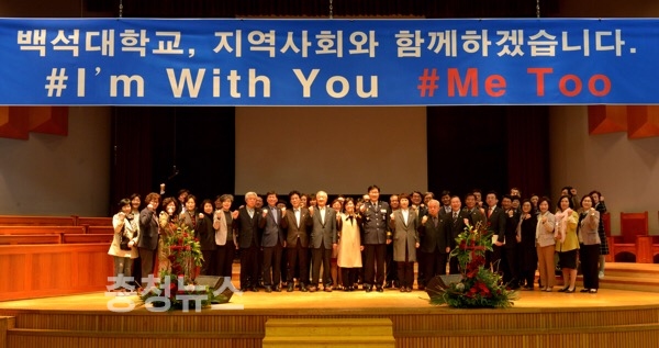 이날 행사에는 백석대학교 교직원들을 비롯해 천안동남경찰서 김영배 서장, 천안시여성협의회 이혜주 회장, 천안지역 여성 CEO 김연희 대표, 지역 여성단체 회원 등이 함께 ‘미투 운동’ 지지를 선언했다.