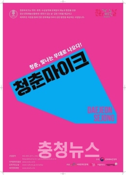 대전시 관계자는 “청춘마이크 사업으로 지역 청년예술가들의 일자리 창출은 물론이고, ‘문화가 있는 날 주간’대전․세종 지역 청년예술인의 다채롭고 수준 높은 공연을 통해 시민들의 문화예술 향유 기회가 확대될 것으로 기대된다”고 전했다.