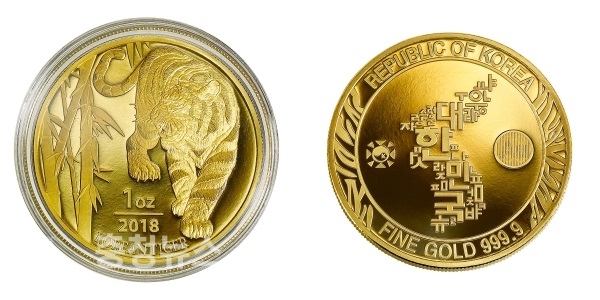 ‘2018 호랑이 불리온 메달’은 앞면에 대나무 옆을 위엄있게 걸어가는 호랑이의 모습을 사실적으로 표현했다. 뒷면에는 위변조 방지를 위해 보는 각도에 따라 글자가 변화(Au↔9999)하는 특수기술인 잠상기법을 적용했다.