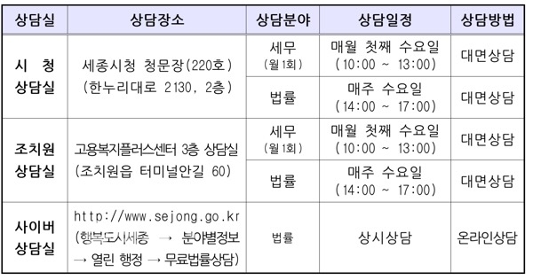 세종시는 매주 수요일 정기적으로‘무료법률상담실’을 운영하며, ‘찾아가는 무료법률상담’과 市 홈페이지를 통한‘사이버 무료법률상담’도 함께 운영하고 있다.