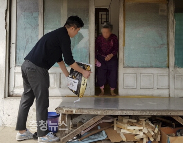 송촌동주민센터 사회복지 담당 주무관이 홀몸 어르신에게 후원물품을 전달하고 있는 모습]