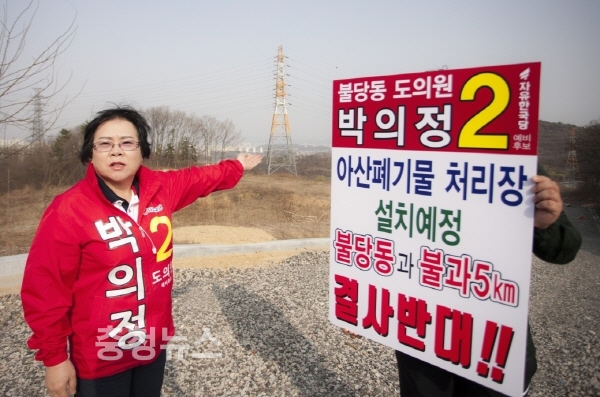 천안 불당동 충남도의원 박의정 예비후보는 2일 한 민간업체 (주)삼호에너지가 아산시 음봉면 동암리에 폐기물처리시설을 추진하기 위해 사업계획서를 금강유역환경청에 제출했다는 소식을 듣고 “결사반대 운동을 전개할 것”이라고 밝혔다.