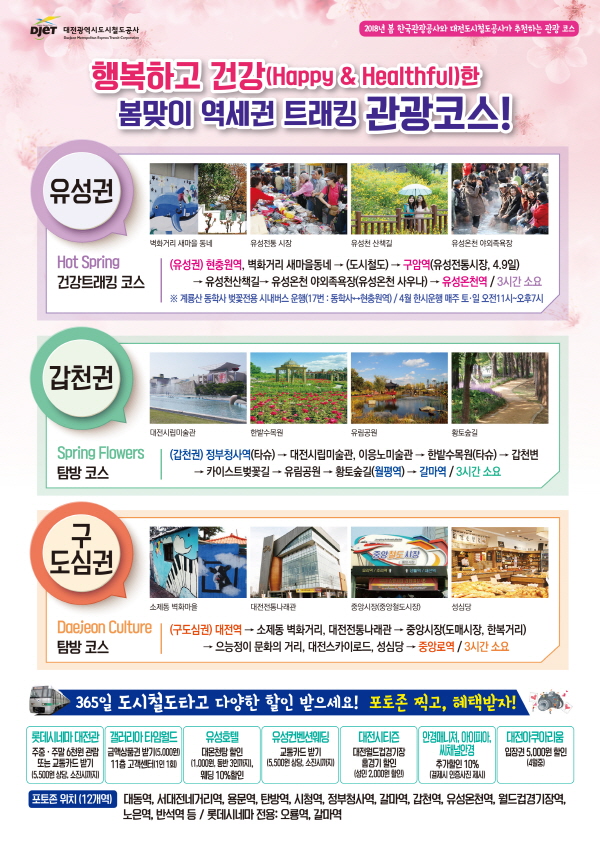 공사가 개발한 3개 코스는 도시철도가 지나는 중구, 서구, 유성구의 대표적인 명소를 포함하고 있어 4월 벚꽃시즌과 5월 가정의 달에 가족 단위로 움직일 수 있는 최적의 도심 트래킹 코스가 될 것 이라고 공사관계자는 설명했다.