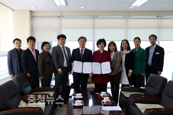 박산우(좌측 다섯 번째) 국립장성숲체원장이 광주 북구 오치동 소재 광주광역시교육연수원에서고향숙 원장(우측 다섯 번째)과 ‘지속가능 발전교육’ 실현을 위한 업무협약(MOU)을 체결한 뒤 기념촬영