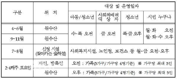 여름철(7~8월)에는 사회복지시설, 노인정, 보건소(임산부 대상) 등 취약계층을 위한 ‘찾아가는 숲해설’을 운영하며, 매월 2, 4째주 토요일 제천‧방축천에서 ‘가족숲’도 운영할 예정이다.