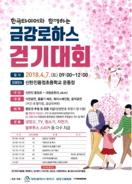 금강로하스축제의 일환으로 마련된 이번 걷기 대회는 대덕구 신탄진동 용정초등학교를 출발해 로하스 대청공원까지 5.6km 구간을 걸으며 몸과 마음을 힐링하는 시간을 가질 계획이다.