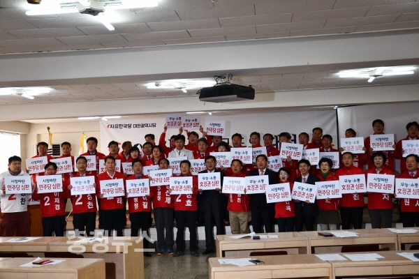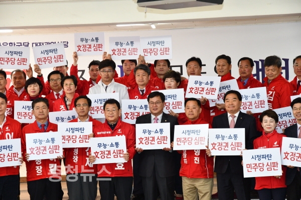 후보자들은 또 ‘시정파탄 민주당과 무능한 문재인정권 심판’ 이라는 문구의 피켓을 들고 구호를 외치며 자유한국당의 6.13 지방선거 필승을 다짐했다.