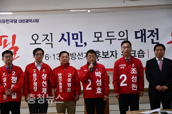박성효 대전시장 후보는 “자유한국당이라는 큰 배에 탄 후보자들이 대전시를 구하겠다는 열정과 각오로 부지런하게 노를 젓고 상호협력 한다면 반드시 목적지에 도착할 수 있을 것” 이라며 “후보자 모두가 진정성을 가지고 대전 시민들께 다가간다면, 그 뜻이 반드시 통하리라 생각한다. 민주당의 오만함을 자유한국당의 성실함으로 극복해 반드시 승리하자”고 강조했다.