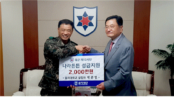 을지재단은 박준영 을지대학교 설립자가 5일 강원도 인제군 을지부대(사단장 박용준)를 방문해 국군장병들의 사기진작 및 복지증진을 위해 써 달라며 개인 사재로 나라튼튼 방위성금 2000만 원을 전달했다고 6일 밝혔다.