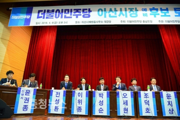 윤권종 선문대 교수의 사회로 진행된 이날 토론회에는 오세현 전 아산시 부시장 외에 전성환, 이위종, 박성순, 조덕호, 윤지상 등 6명의 예비후보들과 200여 명의 청중들이 참석해 후보들의 정책에 귀를 기울였다.