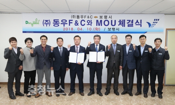 충남 보령시는 10일 오후 시청 상황실에서 김동일 시장과 배진영 동우 F&C 대표이사 등 관계자 10명이 참석한 가운데 투자 유치 협약식을 가졌다.