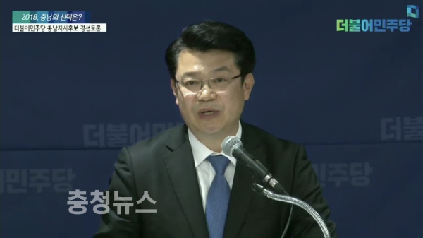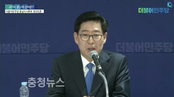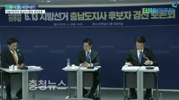 더불어민주당 충남도지사 경선토론회에서 복기왕 예비후보와 양승조 의원이 서로 국회의원 자리를 양보해 눈길을 끌었다.