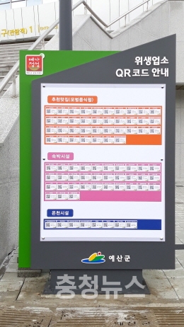예산군 위생업소 QR코드 안내 서비스는 현재 10개 지역(예산터미널, 예산역, 예당국민관광지, 수덕사, 충의사, 추사고택, 예산운전면허시험장, 봉수산휴양림, 리솜스파캐슬, 윤봉길체육관)에서 확인 할 수 있다.