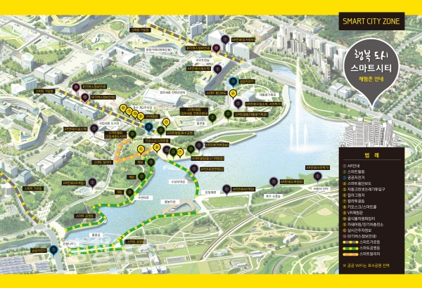 ▲스마트 알리미(미세먼지, 응급상황) ▲스마트 가로등과 공원등(차량과 사람 인식 밝기 조절) ▲서비스 안내 키오스크 ▲전기차 충전소 등이 있다.