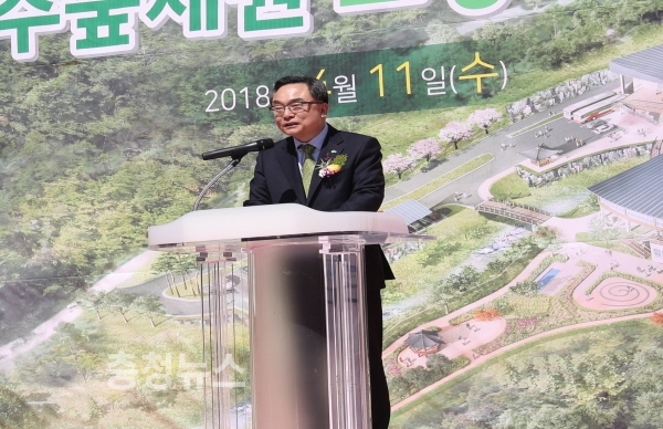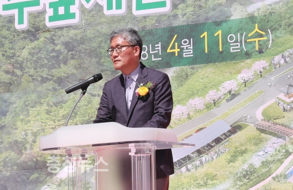 윤영균 한국산림복지진흥원장이 11일 전남 나주시 경현동 산 1-6번지 일원에서 개최된국립나주숲체원 기공식에서 인사말을 하고 있다