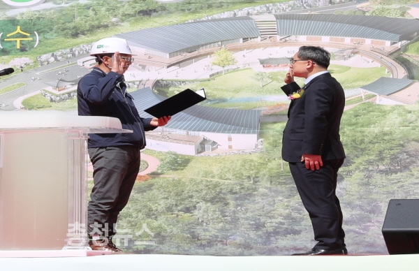 윤영균(우측) 한국산림복지진흥원장이 11일 전남 나주시 경현동 산 1-6번지 일원에서 개최된 국립나주숲체원기공식에서 시공사 관계자와 함께 성실시공 선서를 하고 있다