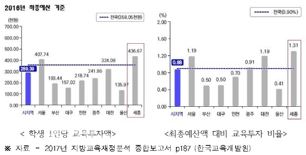 이는 광역시 중 학생 1인당 교육투자액 및 예산액대비 교육투자 비율 1위를 나타내고 있다.