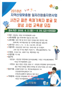 젊은 축제기획자 발굴 및 양성 지원 사업은 서천군 조례기준 청년(만18세~만39세) 15명을 대상으로 우리군 미디어문화센터의 인력과 장비를 활용해 축제 기획, 홍보 기획 등 미디어 전문가를 양성하여 청년들의 일자리창출, 고용촉진, 직업능력 개발을 목적으로 추진되는 교육 훈련이다.
