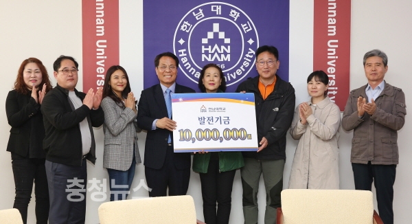 한남대(총장 이덕훈)는 12일 대학 주변 원룸 건물주 16명이 십시일반 모은 1000만 원을 대학발전기금으로 기탁했다고 밝혔다.