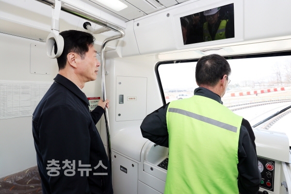 김상균 이사장(왼쪽)이 김포도시철도 차량에 탑승하여 품질 등을 점검했다.
