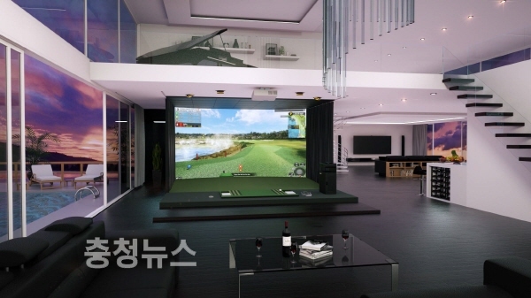 미국의 주거 공간에 설치된 골프존의 프리미엄 스크린골프 시스템 컴퓨터 그래픽 이미지
