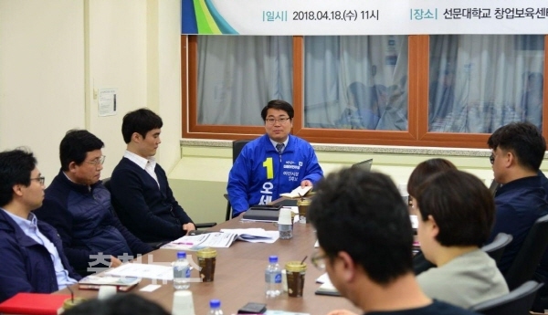 오세현 더불어민주당 아산시장 예비후보가 18일 선문대학교 창업보육센터 3층 회의실에서 입주기업 대표들과 대학 창업보육센터 지원방안과 지방정부의 기업지원 방안, 벤처기업 발전 방향 등에 대한 논의가 이루어졌다.