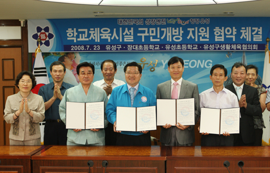 유성구는 23일 중회의실에서 진동규 유성구청장과 장대초교, 유성초교 등 학교 관계자, 구 생활체육협의회 관계자 등이 참석한 가운데 ‘학교체육시설 개방 및 지원을 위한 협약’을 체결했다.